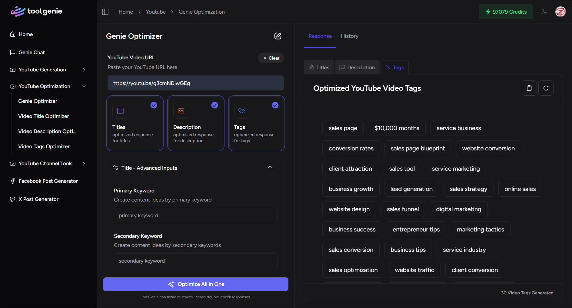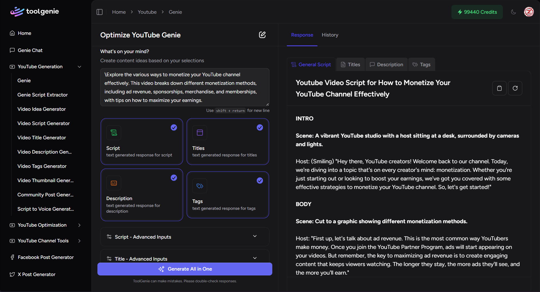 As a visual-heavy channel, I love how ToolGenie handles titles, tags, and thumbnails without me switching tools. This platform just gets creators.